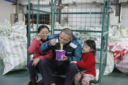 11月13日晚上,原本一片繁忙的四川省成都市郵政分公司火車東站攬投部內(nèi),突然響起了一個孩子的聲音:“爸爸,面泡好了,快過來吃吧?!薄白繉?,蘋果叫你了,趕快停下來先去吃幾口??催@架勢,今天又要忙到后半夜了?!睌埵战M組長余軍躍拍了拍正忙著卸車的攬收員卓寧說,“放心,這兒有我頂著。”