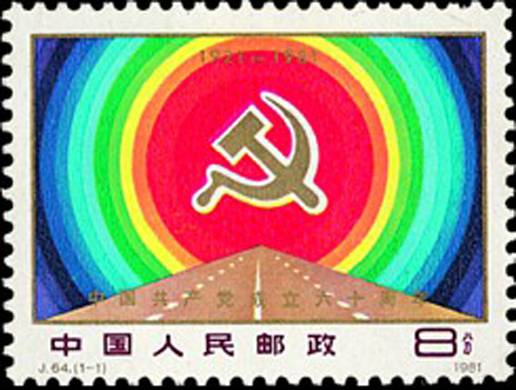 中國共產黨第一次全國代表大會于1921年7月23日至31日在上海和浙江嘉興召開,出席大會的有各地共產主義小組選舉推派的代表共13人,代表黨員57人。大會通過了中國共產黨的第一個黨章。該套郵票由劉碩仁設計,于1981年7月1日發(fā)行。
