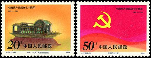1921年7月召開的中國共產黨第一次全國代表大會正式宣告了中國共產黨的誕生,第一枚郵票展現(xiàn)了會址之一——浙江嘉興南湖紅船。該套郵票由雷漢林設計,于1991年7月1日發(fā)行。