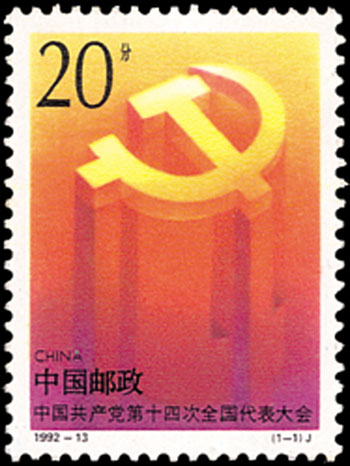 中國共產黨第十四次全國代表大會于1992年10月12日至18日在北京舉行。參加這次大會的正式代表1989人(出席開幕式1965人),特邀(1927年以前入黨,并在黨內擔任過重要領導職務,德高望重的老黨員)代表46人(出席開幕式35人),代表全國5100萬黨員。該套郵票由雷漢林設計,于1992年10月12日發(fā)行。