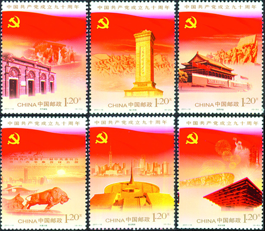 為慶祝中國共產黨成立九十周年,2011年7月1日,中國郵政發(fā)行《中國共產黨成立九十周年》紀念郵票一套6枚,分別表現(xiàn)了中國共產黨在九十年間所經歷的6個重要階段:開天辟地、烽火歲月、執(zhí)政創(chuàng)業(yè)、改革大潮、世紀跨越、科學發(fā)展。該套郵票由郝旭東設計。