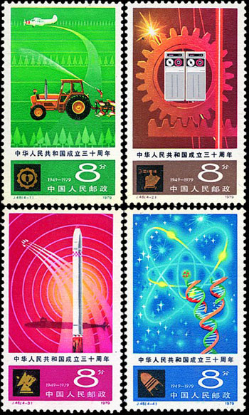這套郵票屬于第五組中華人民共和國成立30周年紀念郵票,一套4枚,分別從農業(yè)、工業(yè)以及國防現(xiàn)代化和科技技術現(xiàn)代化事業(yè)方面展現(xiàn)了我國建國30周年的發(fā)展狀況。該套郵票由薛世哲設計,于1979年10月1日發(fā)行。