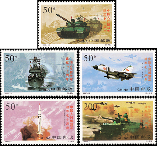 1997年8月1日,中國郵政發(fā)行了《中國人民解放軍建軍七十周年》紀念郵票一套5枚,票名分別是“陸軍”“海軍”“空軍”“戰(zhàn)略導彈部隊”和“陸海空聯(lián)合作戰(zhàn)演習”。該套郵票一改過去以人為主的模式,著重展示了我軍精良的現(xiàn)代化裝備,由季宏敏、姚斌、駱根興、李翔設計。