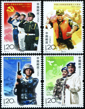 2007年8月1日發(fā)行《中國人民解放軍建軍八十周年》紀念郵票一套4枚,生動表現(xiàn)了中國人民解放軍在黨的領導下,參加抗洪搶險、進行軍事訓練以及參與聯(lián)合國維和行動的英姿,集中反映了軍隊建設的發(fā)展成就、優(yōu)良傳統(tǒng)和我軍忠實履行歷史使命的時代風采。該套郵票由李翔、張樹軍、張衛(wèi)奇、劉偉設計。