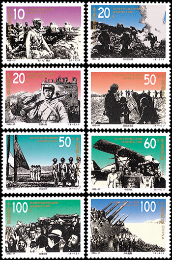 1995年9月3日,中國郵政發(fā)行了《抗日戰(zhàn)爭暨世界反法西斯戰(zhàn)爭勝利五十周年》紀念郵票,一套8枚。該套郵票的設計比較有特色,將8幅照片經過處理,形成類似于版畫的效果躍然紙上,背景采用了不同的顏色。這8枚郵票反映了抗日戰(zhàn)爭中的八大事件,包括:七七事變、臺兒莊大捷、百團大戰(zhàn)、敵后游擊隊、芒友會師、華僑捐獻、臺灣光復、偉大勝利。該套郵票由何潔、陳楠、馮小紅設計。