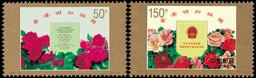 1997年7月1日,香港回到了久離的祖國母親的懷抱。為了紀念這一歷史時刻,郵電部發(fā)行了《香港回歸祖國》郵票一套2枚,小型張1枚。這套郵票的畫面設計以歷史性文件為中心,下部飾以環(huán)繞的花卉。第一枚郵票面值為50分,表現(xiàn)的是中英兩國政府簽署的《中英聯(lián)合聲明》。該聲明確定中國將恢復對香港行使主權,反映了新中國外交工作的巨大成就。聲明下部圍繞著原產于中國、為英國人所喜愛的、象征和平、表示慶賀的月季花,寓意中英兩國通過談判圓滿解決了歷史遺留的問題,回歸后的香港更加和平幸福。第二枚郵票面值為150分,表現(xiàn)的是七屆全國人大三次會議通過并頒布的《中華人民共和國香港特別行政區(qū)基本法》。該套郵票由任宇、王虎鳴設計,于1997年7月1日發(fā)行。