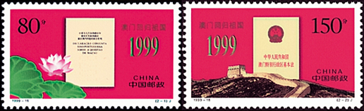 1999年12月20日,為了紀念澳門回歸祖國,國家郵政局發(fā)行了《澳門回歸祖國》紀念郵票一套2枚。郵票第一枚為“中葡聯(lián)合聲明”,畫面以《中葡聯(lián)合聲明》為中心,左下角飾以荷花襯托。第二枚為“澳門基本法”,畫面以《澳門基本法》為中心,下部飾以長城圖案。該套郵票由楊文清、張桂林設計,于1999年12月20日發(fā)行。