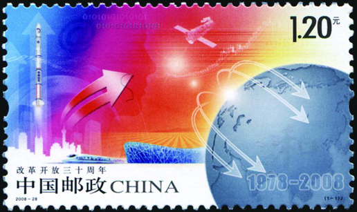 2008年12月18日,為紀念改革開放30周年,國家郵政局發(fā)行了《改革開放三十周年》紀念郵票一套一枚。郵票名為“騰飛”,畫面由多種相關元素構成:地球意在表現(xiàn)全球化的概念,象征著中國融入了世界大家庭;以“神舟七號”宇航員出艙及高速行駛的“和諧號”列車,以及“鳥巢”、箭頭和一些電子符號的迭次出現(xiàn),勾畫出一幅改革浪潮在舉國上下全面推進的壯美畫卷。背景中透疊的人像眼睛,寓意改革開放以人為本的理念以及30年來人們思想解放和觀念的改變。這是30年改革的重要成果,也是改革大業(yè)得以進行的思想基礎。該套郵票由王虎鳴設計,于2008年12月18日發(fā)行。