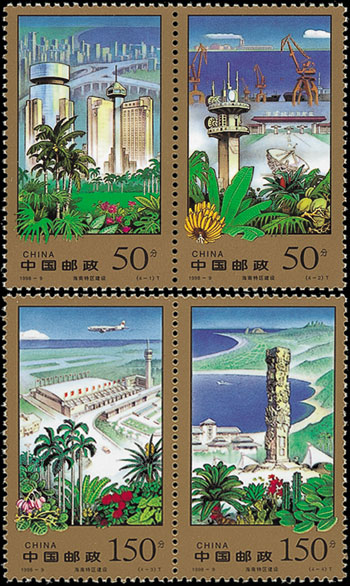 經濟特區(qū)是在對外經濟活動中,采取更為開放的政策,以吸引外國投資,繁榮本地區(qū)經濟的一些城市與地區(qū)。這套郵票上的經濟特區(qū)分別是深圳、珠海、汕頭、廈門、海南。這些經濟特區(qū)的設立為我國的改革開放闖開了一條新路。該套郵票由王振華、陳曉聰設計,于1994年12月10日發(fā)行。