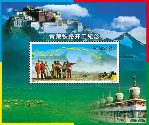 2001年12月29日,為紀念青藏鐵路(格爾木至拉薩)開工,中國郵政發(fā)行了《青藏鐵路開工紀念》紀念郵票小型張1枚。小型張主圖為漢藏技術人員在勘察地形和青藏鐵路示意圖;邊飾左上方為西藏布達拉宮,右上方是火車行駛在唐古拉山,左下方和中間為草原的羊群,右下方是青海塔爾寺;四角邊框分別為藍、紅、黃、綠色。該小型張由閻炳武、楊文清設計。