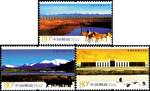 2006年7月1日,為紀念青藏鐵路全線建成通車,中國郵政發(fā)行了《青藏鐵路通車紀念》紀念郵票1套3枚。第一枚為“穿越可可西里”,畫面主圖展現(xiàn)了青藏鐵路穿越可可西里自然保護區(qū)中水平如鏡的碧池、廣袤無垠的草原和遠處平鋪高原湖泊時的壯觀景象。畫面右下角為一群藏羚在閑庭信步。第二枚為“翻越唐古拉山”,畫面主圖展現(xiàn)了在連綿的雪山映襯下,三個巨大的火車頭牽拉著長長的列車猶如一條鋼鐵巨龍翻越唐古拉山時的景象。畫面右下角為一群野牦牛在奔跑企望。第三枚為“拉薩火車站”。畫面主圖展現(xiàn)了在雄偉的布達拉宮映襯下的拉薩火車站主站房。畫面右下角為一行黑頸鶴在輕輕掠過。該套郵票由方軍設計。