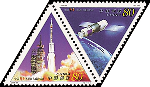 2000年11月20日,為了紀念我國第一艘載人航天飛船“神舟”號成功發(fā)射一周年,中國郵政發(fā)行了《中國“神舟”飛船首飛成功紀念》紀念郵票1套2枚。第一枚為“火箭騰飛”,畫面描繪了長征二號F捆綁式火箭搭載“神舟”號試驗飛船點火升空的精彩瞬間。第二枚為“飛船遨游”,畫面描繪了“神舟”號試驗飛船在太空中遨游的身姿。本套郵票呈等邊三角形,其3個角頂點各有一個大圓形齒孔。該套郵票由王虎鳴、任國恩設計。
