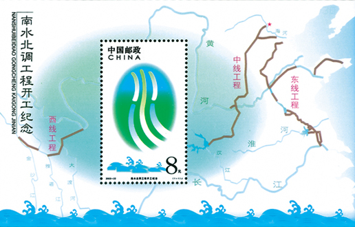 南水北調工程屬于發(fā)展中國經濟的里程碑式工程。我國南北水資源的分布極為不均,南方氣候濕潤,水資源充足,而北方卻干燥干旱,黃土高原便是一個明顯的例子,然而我國大量重工業(yè)卻在北方,因此開啟南水北調工程,將長江水引入黃河各分支,可達到協(xié)調水資源的效果。為了紀念工程開工,中國郵政發(fā)行《南水北調工程開工紀念》郵票小型張1枚,由陳楠設計,于2003年9月26日發(fā)行。
