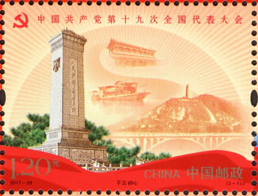 中國共產黨第十九次全國代表大會于2017年10月18日至10月24日在北京召開。這次大會的主題是:不忘初心,牢記使命,高舉中國特色社會主義偉大旗幟,決勝全面建成小康社會,奪取新時代中國特色社會主義偉大勝利,為實現(xiàn)中華民族偉大復興的中國夢不懈奮斗。黨的十九大,是在全面建成小康社會決勝階段、中國特色社會主義發(fā)展關鍵時期召開的一次十分重要的大會。承擔著謀劃決勝全面建成小康社會、深入推進社會主義現(xiàn)代化建設的重大任務,事關黨和國家事業(yè)繼往開來,事關中國特色社會主義前途命運,事關最廣大人民根本利益。為紀念中國共產黨第十九次全國代表大會的召開,中國郵政發(fā)行紀念郵票一套2枚,小型張1枚。郵票圖案內容分別為:不忘初心、繼續(xù)前進,小型張內容為筑夢。該套郵票由馬立航設計,于2017年10月18日發(fā)行。