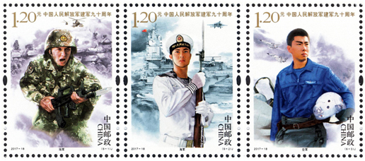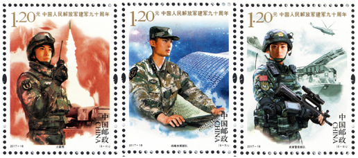 2017年8月1日,中國郵政發(fā)行《中國人民解放軍建軍九十周年》紀念郵票一套6枚,小型張1枚。圖案內容分別為:陸軍、海軍、空軍、火箭軍、戰(zhàn)略支援部隊、武裝警察部隊,小型張內容為聽黨指揮。該套郵票展現(xiàn)了中國人民解放軍的颯爽英姿和中國軍事作戰(zhàn)裝備的硬件實力,主題鮮明,磅礴大氣,畫面具有強烈的動感和威嚴的氣勢。小型張上軍旗飄揚,各軍種英姿颯爽,背景襯托各軍種高尖端裝備,描繪了我軍戰(zhàn)士聯(lián)合作戰(zhàn)的畫面,既表現(xiàn)了中國人民解放軍威武雄壯的軍容和現(xiàn)代化水平,也表現(xiàn)了在黨的指揮下,人民軍隊忠實履行保衛(wèi)祖國、捍衛(wèi)和平的神圣使命。該套郵票的設計者為李翔、李晨、倉亭亭、劉偉、沈璐。