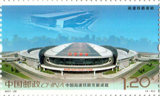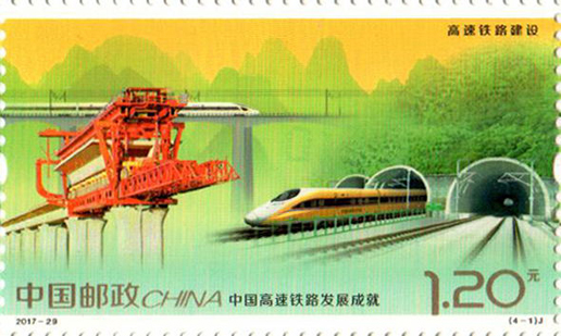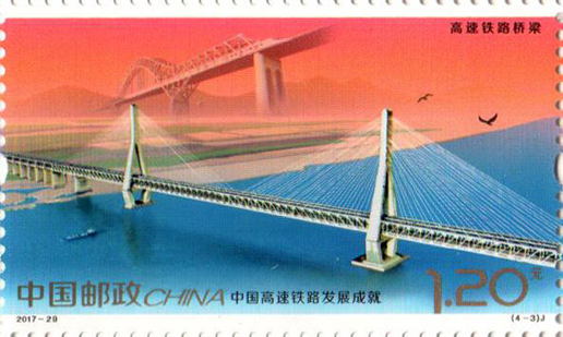 2017年11月25日,中國郵政發(fā)行《中國高速鐵路發(fā)展成就》紀念郵票1套4枚,小型張1枚。圖案內容分別為:高速鐵路建設、高速動車整備場、 高速鐵路橋梁、高速鐵路客站,小型張內容為“復興號”動車組。該套郵票設計者為沈嘉宏,小型張設計者為尚盈。