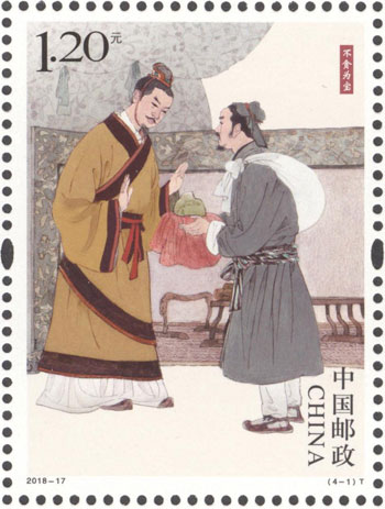 中國五千年的文明史中,剛正不阿、廉潔自律的仁人志士,留下了許多膾炙人口的廉政故事,在華夏文化中已成經典。中國郵政于2018年6月24日發(fā)行《清正廉潔(一)》特種郵票1套4枚,郵票圖案名稱分別為:不貪為寶、羊續(xù)懸魚、兩袖清風和立檄拒禮。該套郵票由胡博綜設計,郵票以中國傳統(tǒng)繪畫的藝術形式,生動還原了四個典故的歷史場景。