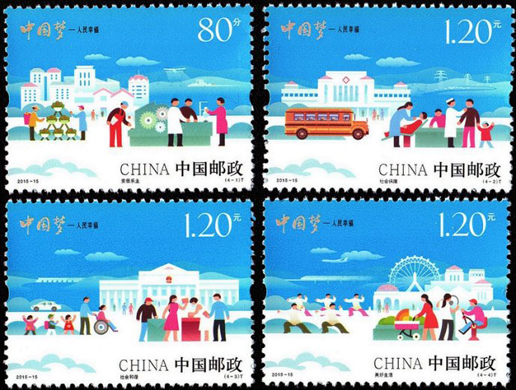 2015年7月25日,為深入揭示“中國夢”的本質內涵,進一步弘揚中國精神,凝聚中國力量,中國郵政發(fā)行了《中國夢—人民幸?!诽胤N郵票一套4枚。郵票內容分別為安居樂業(yè)、社會保障、社會和諧、美好生活。該套郵票畫面以藍天為背景,通過一幅幅插畫描繪出一派和諧祥和的場景,營造出一幅人民幸福的美好愿景,藝術地反映了“中國夢—人民幸?!钡闹黝}。該套郵票由何潔、周岳設計。