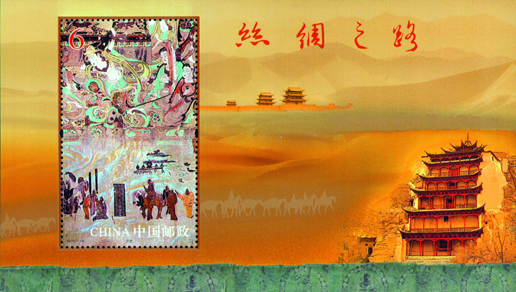 2012年8月1日,中國郵政發(fā)行《絲綢之路》特種郵票一套4枚,小型張1枚。郵票內容分別為千年帝京、大漠雄關、神秘故國、西域勝境,小型張內容為交流。該套郵票由陳景異、惠斌、李群設汁。