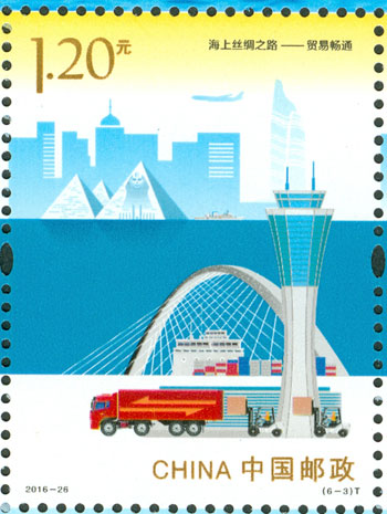 2016年9月10日,中國郵政發(fā)行《海上絲綢之路》特種郵票一套6枚,小全張1枚,郵票內容分別為:政策溝通、設施聯(lián)通、貿易暢通、資金融通、民心相通、海上交通。該套郵票采用六枚聯(lián)票形式設計,以畫面中部的海平面進行串聯(lián),將畫面分割為前景主題與背景。小全張邊飾以海洋為背景。晨光初現(xiàn),燈塔指引的燈光尚未熄滅,一輪紅日由海平面冉冉升起,喻示著21世紀海上絲綢之路的嶄新開始與光明前景。該套郵票由何潔、周岳設計。