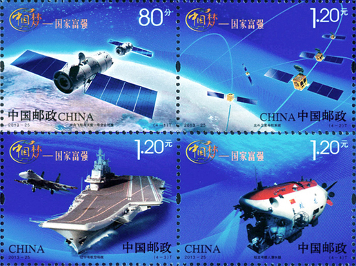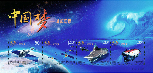 2013年9月29日,中國郵政發(fā)行郵票《中國夢—國家富強》特種郵票一套4枚,小全張1枚。郵票內容分別為神舟飛船與天宮一號交會對接、北斗衛(wèi)星導航系統(tǒng)、遼寧號航空母艦、蛟龍?zhí)栞d人潛水器。該套郵票展現(xiàn)了神十、北斗、蛟龍、航母四個方面的偉大成就,體現(xiàn)了國家富強、社會關注的焦點。該套郵票由何潔、周岳設計。