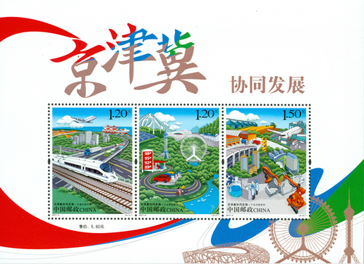 2017年3月9日,中國郵政發(fā)行《京津冀協(xié)同發(fā)展》特種郵票一套3枚,圖案內容分別為:交通互聯(lián)互通、生態(tài)聯(lián)防聯(lián)治、產業(yè)對接協(xié)作。該套郵票以交通、生態(tài)、產業(yè)的“三個突破”為表現(xiàn)內容,著力體現(xiàn)京津冀協(xié)同發(fā)展戰(zhàn)略中先行啟動的領域。該套郵票由鄒慶設計。