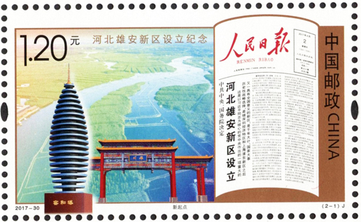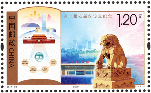 2017年12月22日,中國郵政發(fā)行《河北雄安新區(qū)設立紀念》紀念郵票1套2枚。圖案內容分別為:新起點、新使命。該套郵票猶如徐徐展開的畫卷,昭示著在以習近平同志為核心的黨中央堅強領導下,雄安新區(qū)發(fā)展的美好前景。該套郵票設計者為武世寧。