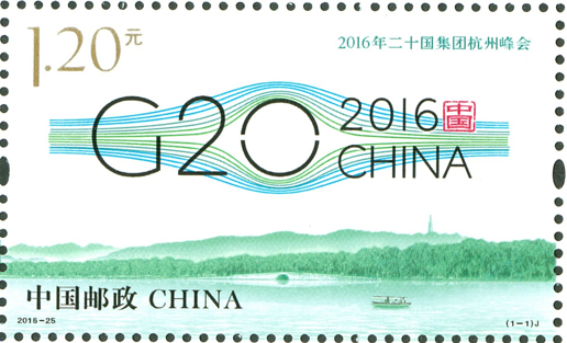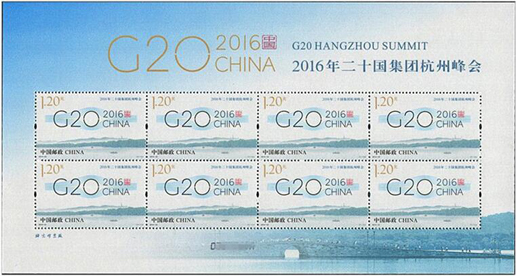 二十國集團(G20)領導人第十一次峰會于2016年9月4日至5日在浙江省杭州市舉辦,這是中國首次主辦二十國集團峰會。中國郵政于2016年8月27日發(fā)行《2016年二十國集團杭州峰會》紀念郵票1套1枚,杭州峰會會標圖案由20根線條勾勒出一個橋形輪廓,寓意二十國集團已成為全球經濟增長之橋、國際社會合作之橋、面向未來的共贏之橋。該套郵票由何潔、孟夢設計。