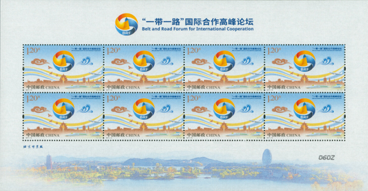 “一帶一路”國際合作高峰論壇于2017年5月14日至15日在中國北京舉辦。中國郵政在論壇開幕當天發(fā)行《“一帶一路”國際合作高峰論壇》紀念郵票一套1枚,郵票以論壇標識為主體,畫面中水紋元素代表了財富和海上絲路,祥云代表了路上絲綢之路,體現(xiàn)了水利萬物和包容、圓融的思想。郵票下方的城市剪影結合了古代文明遺址與現(xiàn)代建筑,反映了全國各地積極響應國家“一帶一路”戰(zhàn)略,體現(xiàn)了中國愿與沿線國家一道,攜手共建“一帶一路”,從而實現(xiàn)和平、發(fā)展與繁榮的共同愿景。該套郵票由董琪設計。