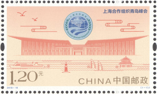 上海合作組織成員國元首理事會第十八次會議于2018年6月9日至10日在山東省青島市舉行,中國郵政于2018年6月9日發(fā)行《上海合作組織青島峰會》紀念郵票1套1枚。郵票以上海合作組織會徽及主場館——青島國際會議中心線描圖為主要元素,以祥云、海鷗為裝飾;畫面下方以線描手法,表現(xiàn)海上棧橋、帆船、燈塔、輪船等景物,展現(xiàn)了會議舉辦地——黃海明珠青島的特色,整體設計簡潔明快,主題突出。該套郵票由于秋艷、邢文偉設計。