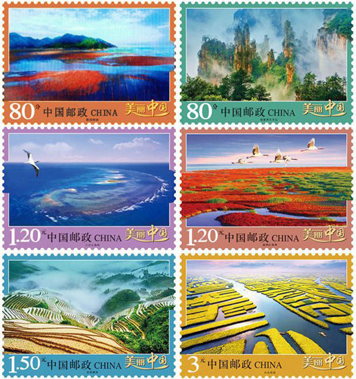 中國郵政于2013年5月19日發(fā)行《美麗中國》普通郵票第一組,一套6枚,郵票展現(xiàn)了我國六處風情各異的美麗景觀:霞浦灘涂、張家界天子山、三沙七連嶼、盤錦紅海灘、龍勝梯田、興化垛田。該套郵票由馬立航、姜偉杰設計。