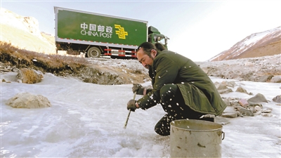冰雪天氣,其美多吉在雪線郵路鑿冰取水。(四川省委宣傳部供圖)