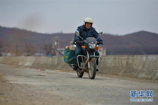 在琿春市春化鎮(zhèn),金仁哲騎著摩托車在送郵件的路上。