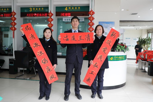 日前,郵儲(chǔ)銀行河南省開(kāi)封市分行紀(jì)委分派紀(jì)檢監(jiān)察人員到各支行網(wǎng)點(diǎn)進(jìn)行檢查并送去廉潔春聯(lián)。該分行紀(jì)委強(qiáng)調(diào)節(jié)日期間各單位要深入貫徹落實(shí)中央八項(xiàng)規(guī)定精神,持之以恒正風(fēng)肅紀(jì),嚴(yán)防“四風(fēng)”問(wèn)題反彈回潮。通過(guò)送廉政春聯(lián)提醒廣大干部職工在節(jié)日期間要廉潔自律。圖為濱河路支行員工展示廉潔春聯(lián)?! 跷夯勖?nbsp; 攝影報(bào)道