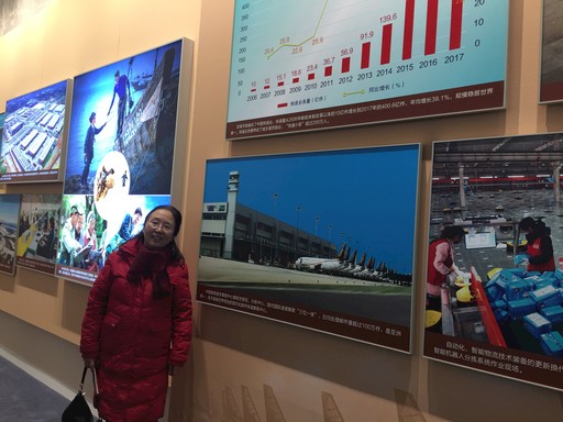 魏俊榮在“偉大的變革——慶祝改革開放40周年大型展覽”現(xiàn)場(chǎng)與她最驕傲的作品南集中心合影。朱曉忠 攝