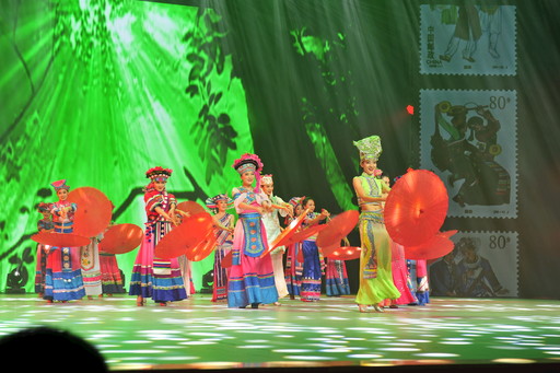 以郵票為背景,云南少數(shù)民族群眾登上舞臺(tái)。毛詠良 攝