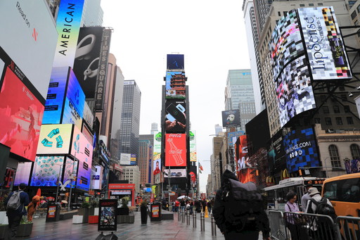 紐約時(shí)報(bào)廣場(chǎng)循環(huán)播放世界郵展宣傳片。新華社記者 張墨成 攝