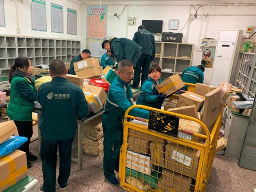 東四郵局北新橋投遞部的郵遞員們開始分揀新到的包裹(央廣記者 馮會玲攝)