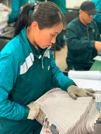 東四郵局投遞部的早晨是從7點開始的。砸郵戳、數報紙、分信件,忙而不亂。幾十斤重的一厚摞報紙砸到桌子上,只見他們右手一翻變成漂亮的扇面,左手拇指和食指一抬一壓快速掠過,轉瞬間每個人就數出了自己要送的報紙數量。