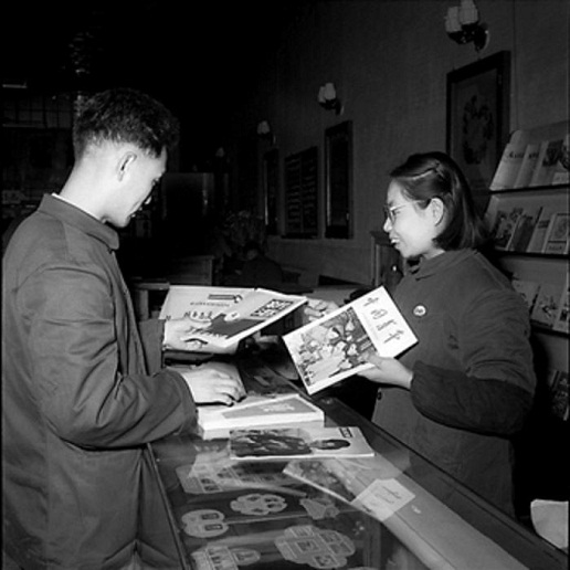 1958年4月,北京。沈秀敏(圖右)對(duì)顧客很熱情,她總是拿著各種雜志主動(dòng)向顧客介紹。工人日?qǐng)?bào) 杜治 攝