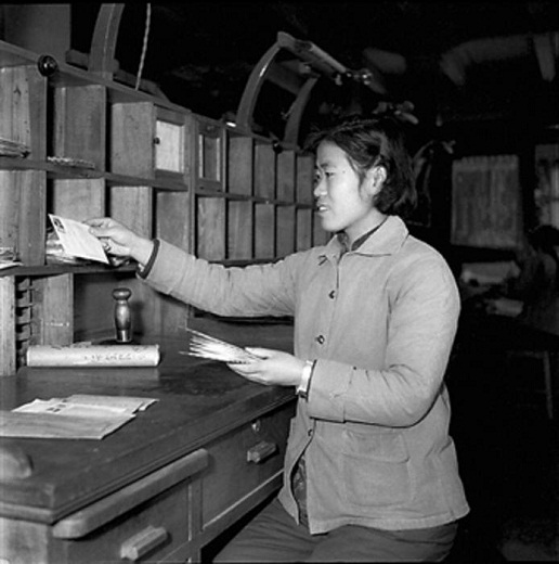 1959年,全國(guó)群英會(huì)代表、北京市東四郵電局投遞員羅淑珍投遞前在做準(zhǔn)備工作。工人日?qǐng)?bào) 王光祿 攝
