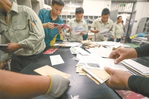 5月31日上午8時(shí),北新橋投遞部的郵遞員在處理完包裹后又開(kāi)始分揀信件。