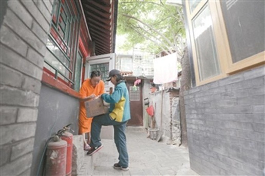 6月4日上午10時(shí),天降小雨,劉小梅已經(jīng)開(kāi)始當(dāng)天的第二趟投遞。在一胡同口,劉小梅和認(rèn)識(shí)的當(dāng)?shù)刈舸蛘泻簟?br />