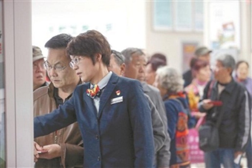 在自動(dòng)存取款機(jī)前,排了十多位老人,樊潔先讓在后面排隊(duì)的老人到休息區(qū)的椅子上休息一下,再一個(gè)個(gè)幫助存取錢的老人辦理業(yè)務(wù)。有的老人聽(tīng)不大清楚,她就湊近耳朵不厭其煩地一字一句地告訴他們,當(dāng)天上午,樊潔在自動(dòng)存取款機(jī)前站著忙活了兩個(gè)多小時(shí)?!皩?duì)我們營(yíng)業(yè)廳的工作人員來(lái)說(shuō),要求來(lái)有迎聲,問(wèn)有答聲,走有送聲,唱收唱付聲。只要用情用心服務(wù),就沒(méi)有辦不成的事?!彼f(shuō)這是東四郵局的傳統(tǒng)。