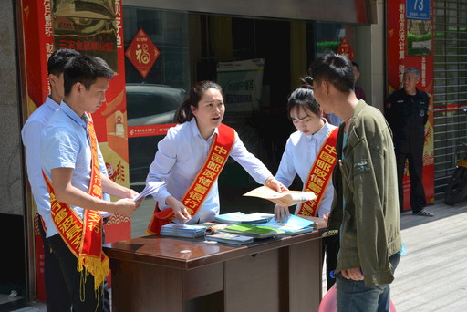 蔡里吉(中)組織支行員工積極宣傳金融知識(shí)。