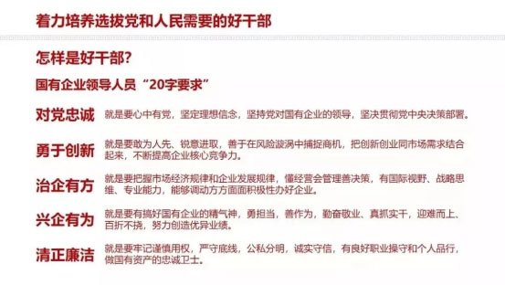 在全國國有企業(yè)黨的建設(shè)工作會(huì)議上,習(xí)近平總書記對(duì)國有企業(yè)領(lǐng)導(dǎo)人員提出了對(duì)黨忠誠、勇于創(chuàng)新、治企有方、興企有為、清正廉潔的“20字要求”。劉愛力在領(lǐng)學(xué)時(shí)表示,中國郵政將習(xí)近平總書記對(duì)國有企業(yè)領(lǐng)導(dǎo)人員的“20字要求”作為選拔干部、培養(yǎng)干部、考核干部的根本遵循,嚴(yán)格貫徹執(zhí)行《黨政領(lǐng)導(dǎo)干部選拔任用工作條例》,堅(jiān)持好干部標(biāo)準(zhǔn),把政治標(biāo)準(zhǔn)放在第一位。