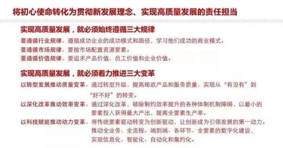根據(jù)中央要求,結(jié)合郵政實(shí)際,劉愛力強(qiáng)調(diào)指出,中國郵政要將“不忘初心、牢記使命”轉(zhuǎn)化為新時(shí)代郵政的責(zé)任擔(dān)當(dāng),切實(shí)做到“六個(gè)轉(zhuǎn)化”。