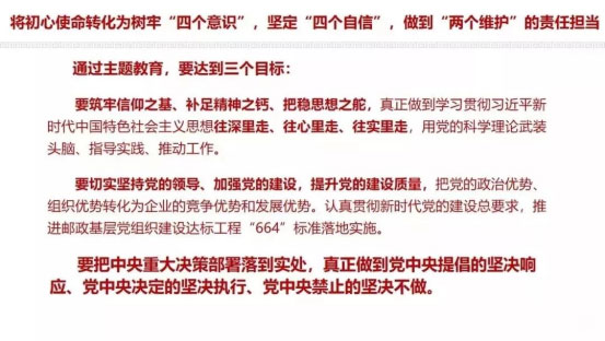開展這次主題教育,就是要堅(jiān)持思想建黨、理論強(qiáng)黨,堅(jiān)持學(xué)思用貫通、知信行統(tǒng)一,推動(dòng)廣大黨員干部不斷增強(qiáng)“四個(gè)意識(shí)”、堅(jiān)定“四個(gè)自信”,堅(jiān)決做到“兩個(gè)維護(hù)”,最關(guān)鍵的是堅(jiān)決維護(hù)習(xí)近平總書記黨中央的核心、全黨的核心地位,做到“三個(gè)體現(xiàn)在”:體現(xiàn)在與黨中央保持高度一致上,體現(xiàn)在嚴(yán)守黨的政治紀(jì)律和政治規(guī)矩上,體現(xiàn)在堅(jiān)決貫徹落實(shí)黨中央重大決策部署上。
