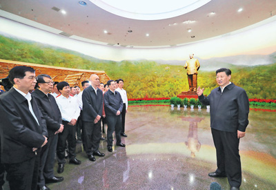 離開來青軒,習(xí)近平來到香山腳下的香山革命紀(jì)念館,參觀了《為新中國奠基——中共中央在北京香山》主題展覽。新建成的紀(jì)念館莊重大氣,“四梁八柱”的雨棚造型寓意黨中央在香山為新中國搭建四梁八柱。28根廊柱,象征中國共產(chǎn)黨從建黨到建立新中國28年的奮斗歷程。南廣場上矗立著高19.49米的國旗桿,寓意中華人民共和國誕生于1949年。主題展覽由“進(jìn)京‘趕考’”、“進(jìn)駐香山”、“繼續(xù)指揮解放全中國”、“新中國籌建”、“不忘初心、牢記使命、永遠(yuǎn)奮斗”5個部分組成,按歷史脈絡(luò),通過800多張圖片、報照、地圖、表格和1200多件實(shí)物、文獻(xiàn)和檔案,全景式生動呈現(xiàn)中共中央在香山期間領(lǐng)導(dǎo)全國各族人民,完成民族獨(dú)立和人民解放的歷史使命、開啟中國歷史發(fā)展新紀(jì)元的光輝歷程。