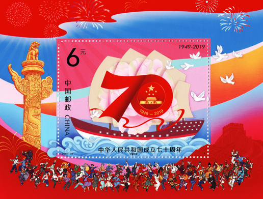 中國郵政定于2019年10月1日發(fā)行《中華人民共和國成立七十周年》紀(jì)念郵票1套5枚,小型張1枚。郵票圖案名稱分別為:經(jīng)濟持續(xù)健康發(fā)展、社會主義民主政治推進、文化繁榮興盛、人民生活不斷改善、建設(shè)美麗中國,小型張圖案名稱為:祝福祖國。全套郵票面值為12元。